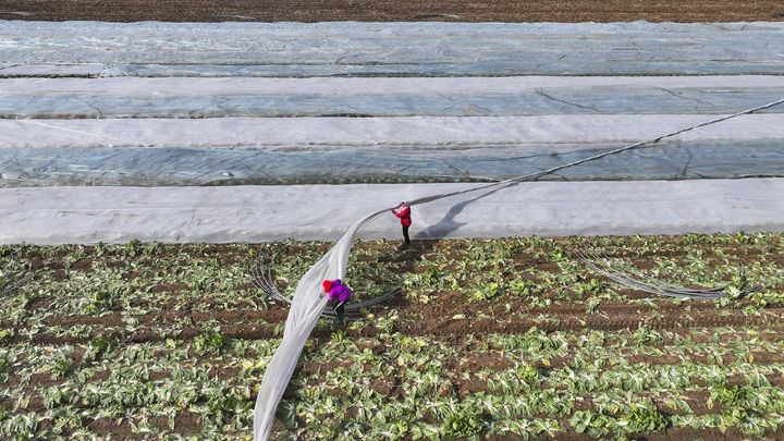 2025年12月11日,正在东营市广饶县李鹊镇,农人为做物笼盖防寒无纺布,应对寒潮(无人机照片)。“县域富平易近财产是农人当场增收的主要载体。”中国农业科学院农业经济取成长研究所研究员钟钰说,要通过订单收购、股权分红、就近用工等,拓宽农人参取财产成长的渠道和体例,公等分享财产成长收益,实现财产强、农人富的良性轮回。